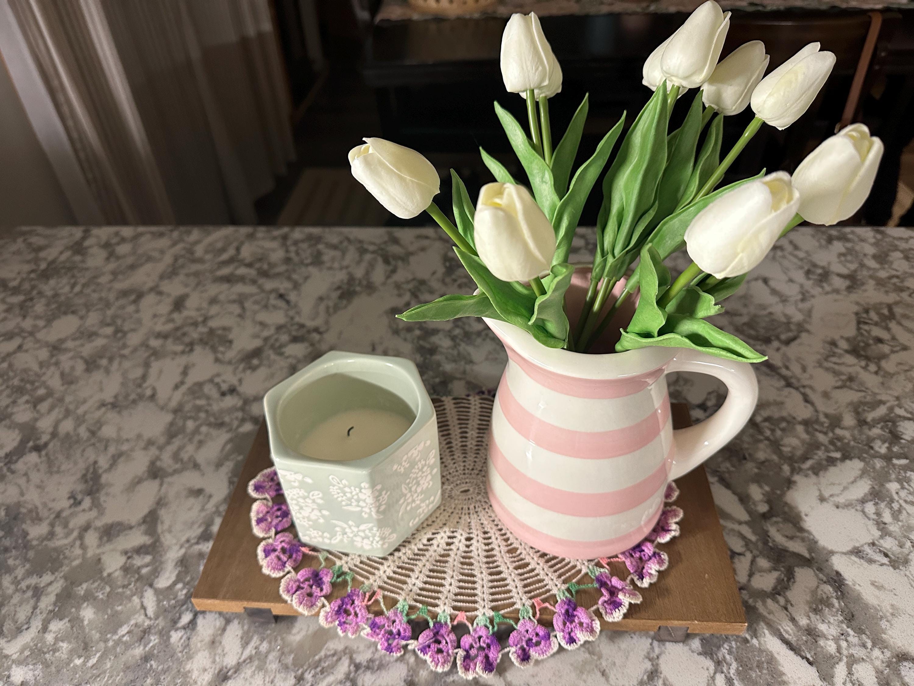 Wonderful communication. Fast shipment. Arrived earlier than originally expected. Thrilled. I will be using these beautiful florals for a wedding bouquet. They are quality and very real like. The feel just like real tulips.